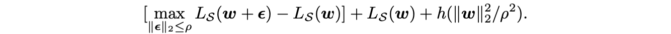 Ld(w)는 오른쪽 수식보다 크거나 작다고 표현될 수 있는데 (여기서 h는 regularization term이다) 사실상 저 부분이 바로 우리가 원하는 sharpness loss를 수식으로 표현한 것이다. 우리는 이를 inequality의 right hand side부분을 아래와 같이 다시 적으면서 확인할 수 있다.