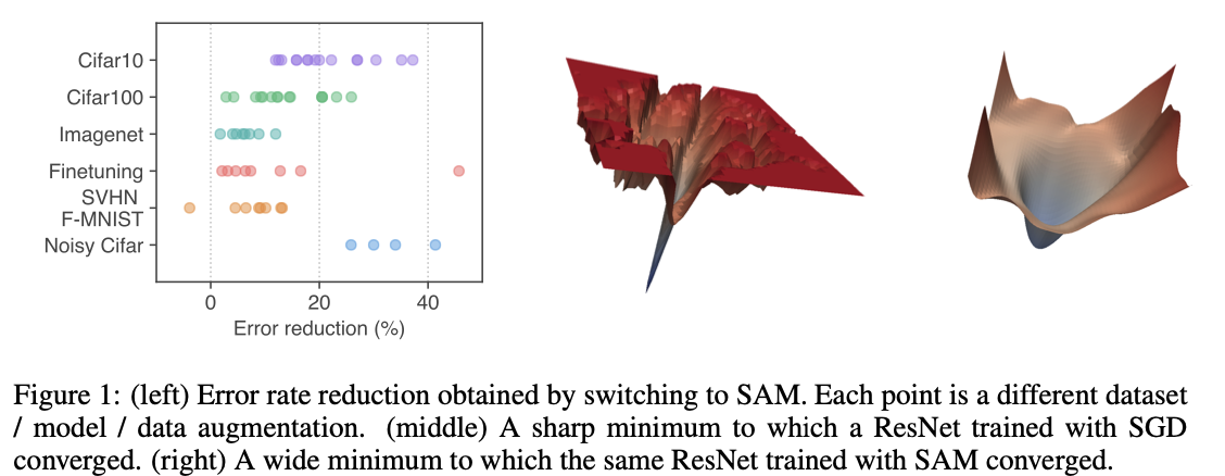 SAM optimization 기법은 2021 ICIR conference paper로 publish되었다. 간단히 이야기하면 Sharpness-Aware Minimization(SAM)은 neighborhood가 똑같이 균일하게 low loss를 갖는 parameter를 추구하기 때문에 SAM은 다양한 데이터셋에 대해 model generalization을 향상시킨다(label noise에 대해 robust함을 제공한다).