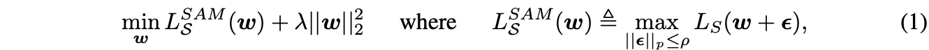 이는 위의 수식에 Ls(w)를 더하고 빼준거라서 결과값은 같음을 알 수 있다. 이제 이 부분을 자세히 살펴보면, 먼저 대괄호가 있는 부분은 Ls의 기울기로 Ls의 sharpness를 측정해주는 역할을 한다. sharpness term(대괄호로 묶여 있는 부분)은 이제 training loss value와 regularizer가 합해지게 된다. 보통 저 h부분을 L2 regularization term으로 사용하며 그렇게 된다면 SAM problem은 결국 아래를 해결하 것으로 수식화 할 수 있다.