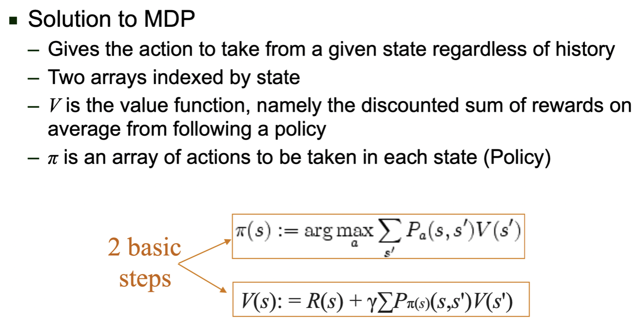 그렇다면 우리는 MDP 문제를 어떻게 풀 수 있을까? MDP의 solution은 위 주황색 박스들로 구할 수 있다. 먼저 𝝅(s)는 state에 대한 action의 distribution을 나타내는 것으로 policy라고 부른다. 이는 현재 state에서 action을 취해 다른 state s'로 갈 확률과 그럴 때 모일 value들의 합을 가장 크게 하는 action을 선택함으로 얻어진다. 그렇다면 그러한 policy를 따를 때 얻어지는 value인 V(s)는 어떻게 구하는 것일까? value는 현재 state에서 얻는 reward와 앞으로 얻을 reward의 합으로 구한다. 왜 현재만의 reward 뿐만 아니라 부가적인 요소도 더하는지에 대해 말하자면, 좋은 정책이란, 현재의 보상을 최고로 취할 수 있는 action이 아닌, 현재부터 나의 target goal까지의 reward들의 합을 최대화하는 action을 행하는 것이기 때문이다.