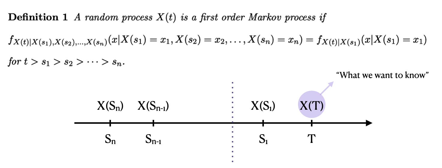 Random process (어떤 실험결과를 하나의 함수에 대응시키는 것으로, 하나의 값에 매핑하는 random variable과 유사하다고 보면 된다)인 X(t)가 다음과 같은 조건을 만족할 때, 우리는 마르코브 프로세스이다 라고 말한다. Sn ...T까지의 discrete한 시간 흐름이 있다고 가정하자. S1까지 X(Sn) .. X(S1)의 시그널이 발생했을 때, (우리가 이미 알고있는 관측값) 우리가 이들로 conditioning 한 X(T)의 probability는 사실 Sn ... S2와는 상관없이 오직 현재 상태인 X(S1)로 conditioning한 probability density와 같다. 이는 다시 말하면 미래는 과거와 독립적이며 이를 통해 나중에 설명할 강화학습은 현재 시점에서 미래를 예측하고 그에 따르는 의사결정을 할 수 있게 된다.