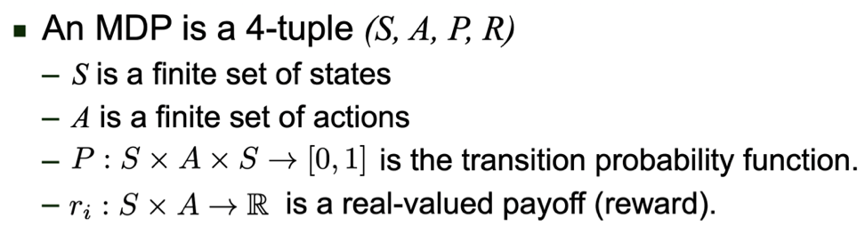 따라서 MDP는 다음과 같은 4개의 요소로 표현할 수 있으며 이는 각각 state, action, transition, reward를 의미한다. 이때 transition은 state에 action을 추가해 state으로 가며 (이러한 이유로 function of action of state라고 불리기도 한다.) state에 action을 취해 또다른 reward가 발생한다는 특징이 있다.