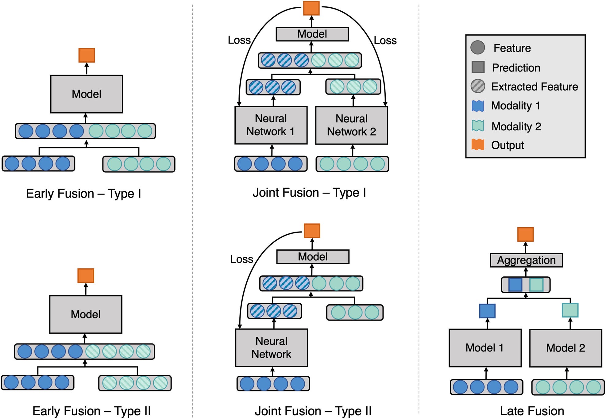 아래 그림은 3개의 주요 fusion strategy를 나타낸다 : early, joint, and late fusion. 이에 대해 하나씩 차근차근 살펴보겠다.