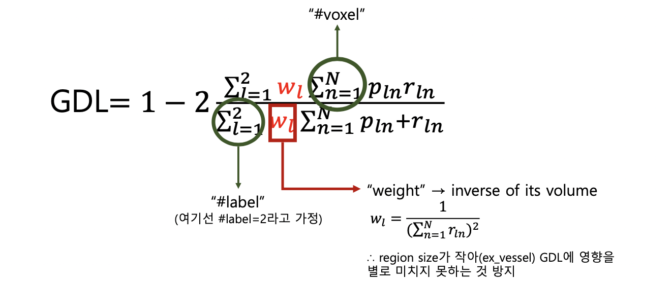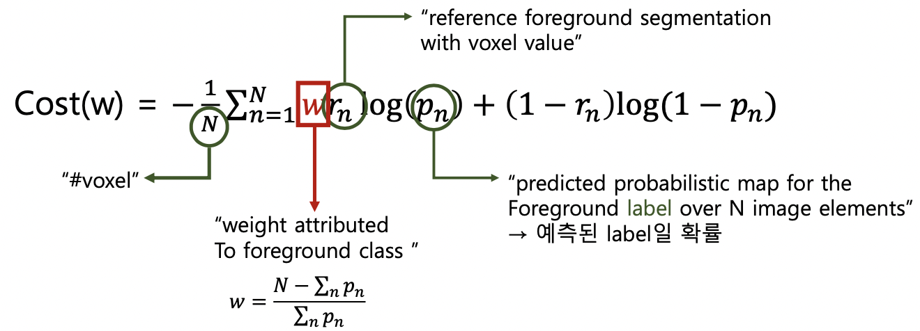 수식을 이해하기 쉽게 예시를 들어 설명하도록 하겠다. 예를 들어 좌측 그림과 같은 input label이 있다고 가정해보자. (우리는 초록색 영역을 segmentationg하는 task를 수행 중이다.) Label(pi=1)에 해당되는 부분(초록)이 적을 경우 cross entropy를 이용하면 해당 p값은 최적의 cost 값을 찾을 때 영향을 적게 준다. 따라서 label(vessel) size(#voxel)이 작을 때 더 큰 w값을 부여해줌으로 class간의 unbalance를 조절해준다. (w가 증가하면 p가 감소하니까..)