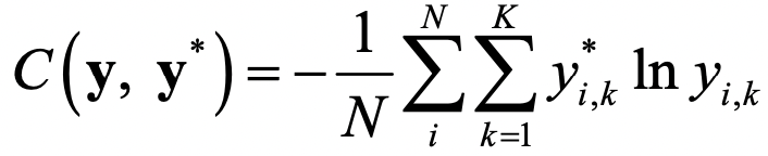 Segmentation은 결국 모든 pixel에 대해서 per-pixel-classification 문제로 해석 가능하기 때문에 가장 간단한 cost function으로는 Cross-entropy를 생각 할 수 있다. Cross-entropy는 우선 각 pixel에서 시행되며, 이렇게 얻은 독립적인 N개의 cross entropy값은 추후 averaged된다. 하지만 주변의 error값을 고려하지 않기 때문에 별로 좋지 않으며, 특정 class가 training data에서 많이 차지하고 있을때 성능이 현저히 저하된다. Segmentation에서 사용하는 cross entropy 값은 아래 수식과 같다.