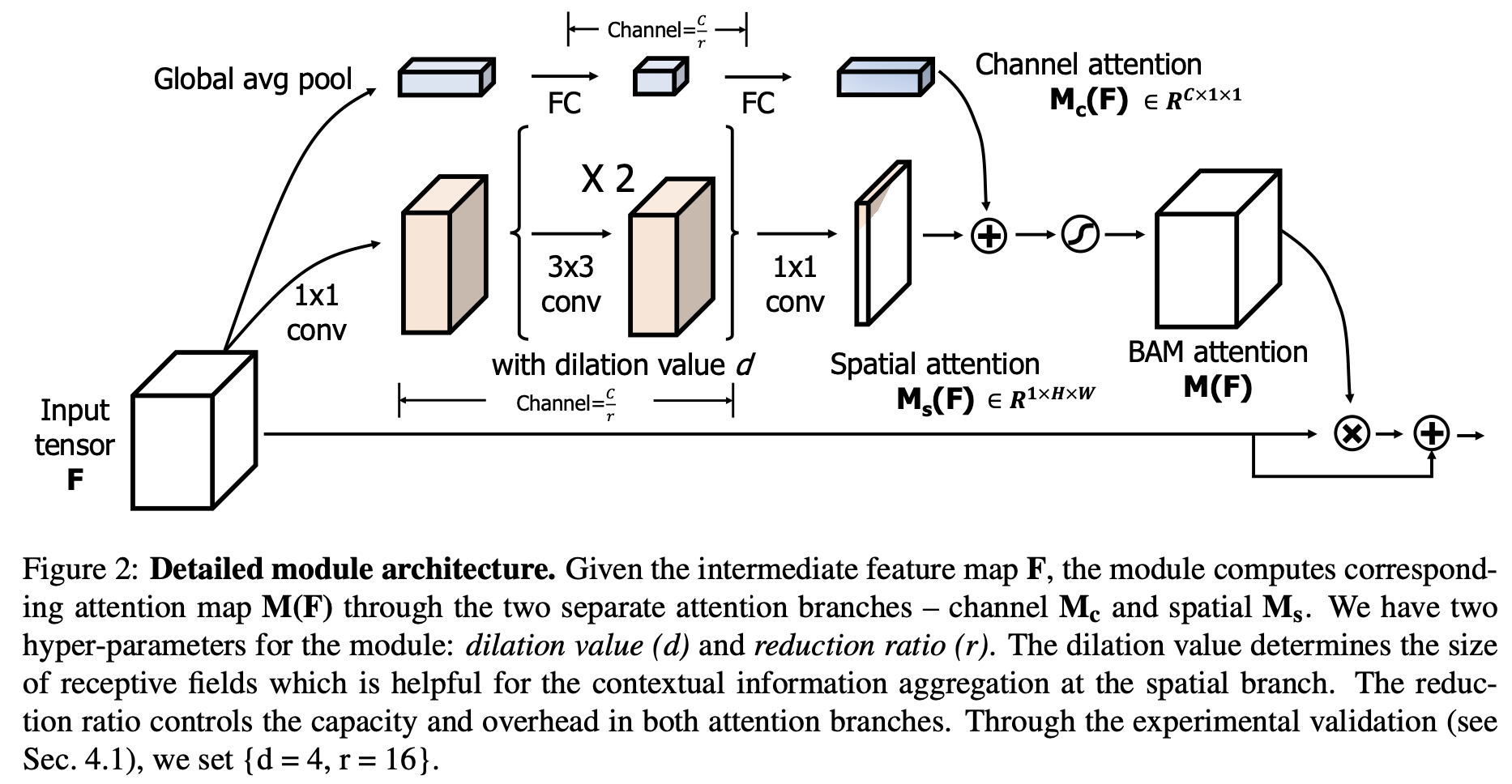 위 그림은 BAM에 대한 전반적인 구조를 보여준다. 주어진 input feature map F(dimension of C*H*W)에 대해 BAM은 3d attention map인 M(F)를 생성하며 따라서 변경된 feature map F'는 아래와 같이 표현 가능하다. (이떄 F와 M(F)는 서로 같은 차원을 지니고 있다.)