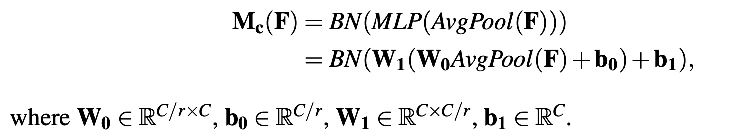 각각의 channel들은 특정 feature response를 포함하고 있기 때문에 저자들은 channel branch에서의 inter-channel relationship을 살펴보았다. 각 채널마다의 feature map을 aggregate하기 위해 global average pooling을 사용하였으며 feature map F에 대해 channel vector Fc (dimension of C*1*1)를 생성하였다. 이 벡터는 각각의 채널별로의 global한 정보를 담고 있다. Fc로부터 채널들간의 attention을 측정하기 위해 하나의 hiddenlayer를 지니고 있는 MLP를 사용하였다.
