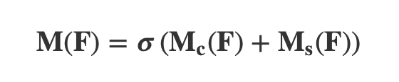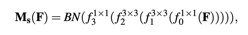 Spatial branch는 spatial attention map인 Ms(F) (dimension of H*W)를 생성하며 각각의 다른 spatial location 별로의 feature들을 강조하거나 억제한다. 효과적으로 문맥상의 정보를 담아내기 위해서는 큰 receptive field를 사용하는 것이 중요하기 떄문에 논문 저자들은 dilated convolution을 사용했다고 한다. feature F은 1*1 convoluion을 사용해 channel dimension으로 feature map을 integrate * compress해주었으며 그 결과 C/r*H*W의 dimension을 갖도록 projected되었다. Reduction 이후에 문맥상의 정보를 효과적으로 추출하기 위해 3*3 dilated convolution이 사용되었다. 마지막으로 feature들은 다시 1*1 convolution을 이용해 1*H*W의 dimension을 갖도록 축소되었다. Spatial attention은 아래와 같이 계산되어진다.