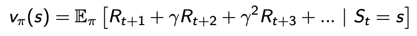 위 수식을 좀 더 자세히 살펴보자. 좌측의 v(s)는 state S로부터 어떤 policy π를 따라갔을 때, 게임이 끝날때까지 얻게되는 총 리워드의 기대값을 의미한다. (policy가 없다면 value function은 정의되지 않는다!!)이제 우측을 살표보겠다. 수식에 보이는 Υ는 discount factor이며 미래 리워드는 불확실하므로 조금씩 줄여서 예측한다. (불확실한 미래값에는 적절한 weighting을 주어 전체 value 계산에 영향이 덜 가게끔 한다.)