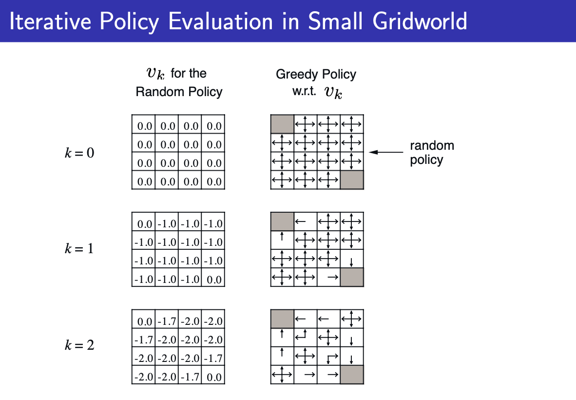즉, 다시 말하자면 (1) Random policy에서의 value function을 평가하고 -> (2) 그것에 대해 greedy하게 움직이는 정핵을 만들고 -> (3) 이렇게 얻어진 정책을 다시 평가해 value function을 업데이트하고 -> ... -> 를 만복하다보면 optimal policy로 간다. (이때 greedy하게 움직인다는 것은 무조건 다음 칸 중에 제일 좋은 value 쪽으로 움직이는 것을 말한다.)