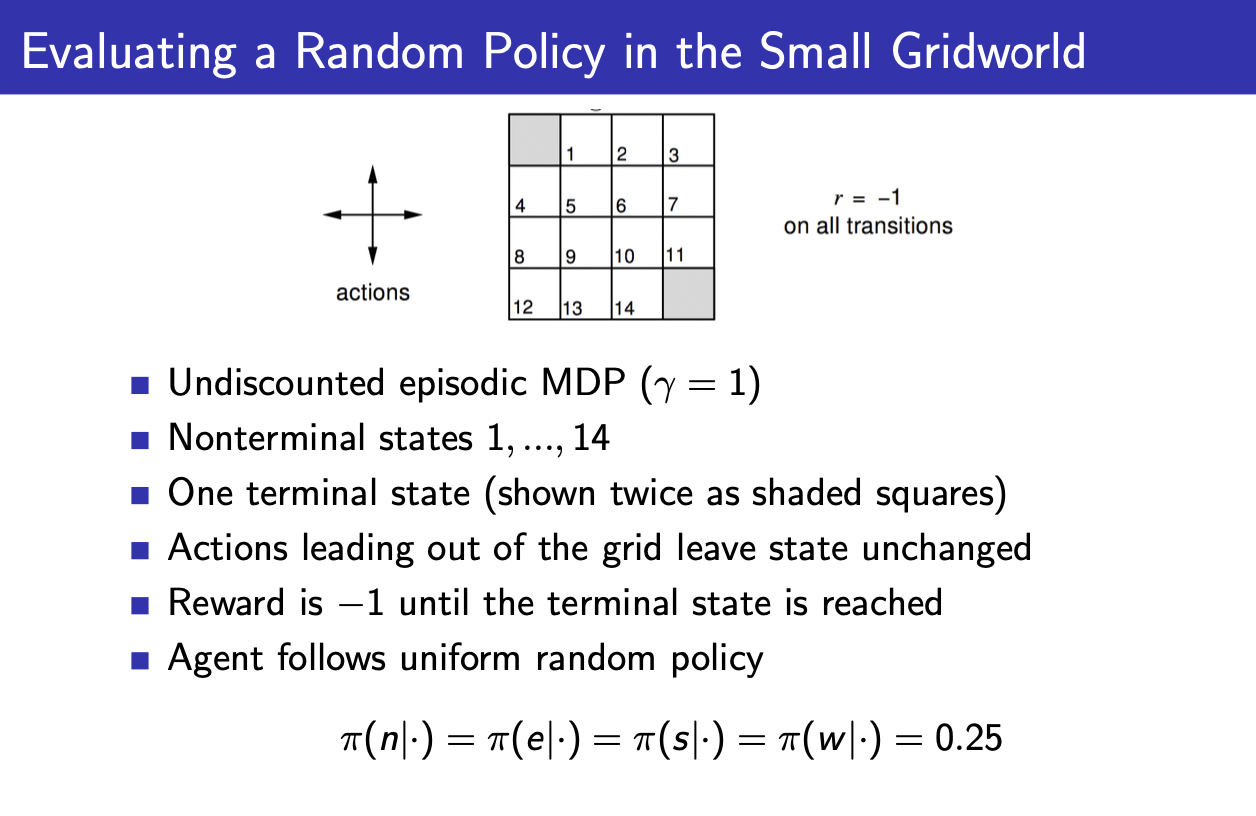 슬라이드에 나와있는 그림으로 예시를 들어보겠다. 임의의 칸에서 회색 칸인 terminal state로 가는 방법에 관한 prediction 문제가 있다고 가정하자. (Terminal state는 1개로, 그림에서는 마치 두개인 것처럼 그려졌지만, 두 칸 모두 같은 state를 의미한다.) 여기서의 Value는 평균 몇칸을 지나야 terminal state에 도달하는가?가 될 것이다. Terminal State에 도달하기까지의 reward는 모두 1이며, Agent는 random policy를 따르기 때문에 동서남북으로 agent가 이동할 확률은 모두 0.25이다.