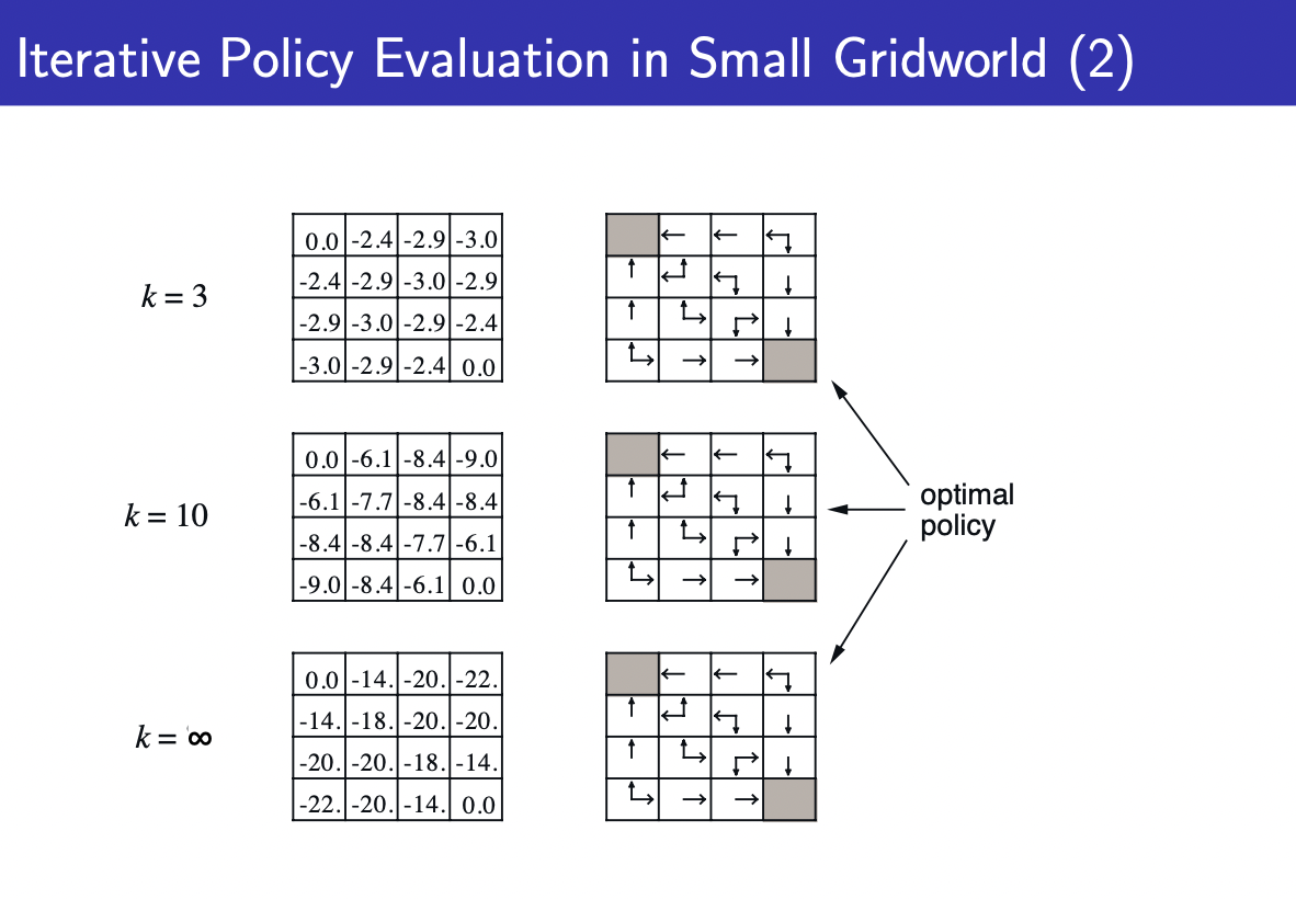 이제 Greedy Policy라고 표현되어 있는 화살표가 그려진 그림도 함께 봐보자. policy 그림은 매 iteration마다 새롭게 업데이트 되다가 k=3부터 어떤 특정 정책으로 수렴하는 모습을 볼 수 있다. David Silver 선생님은 다음 강의에서 이를 아래와 같이 이야기 하였다.