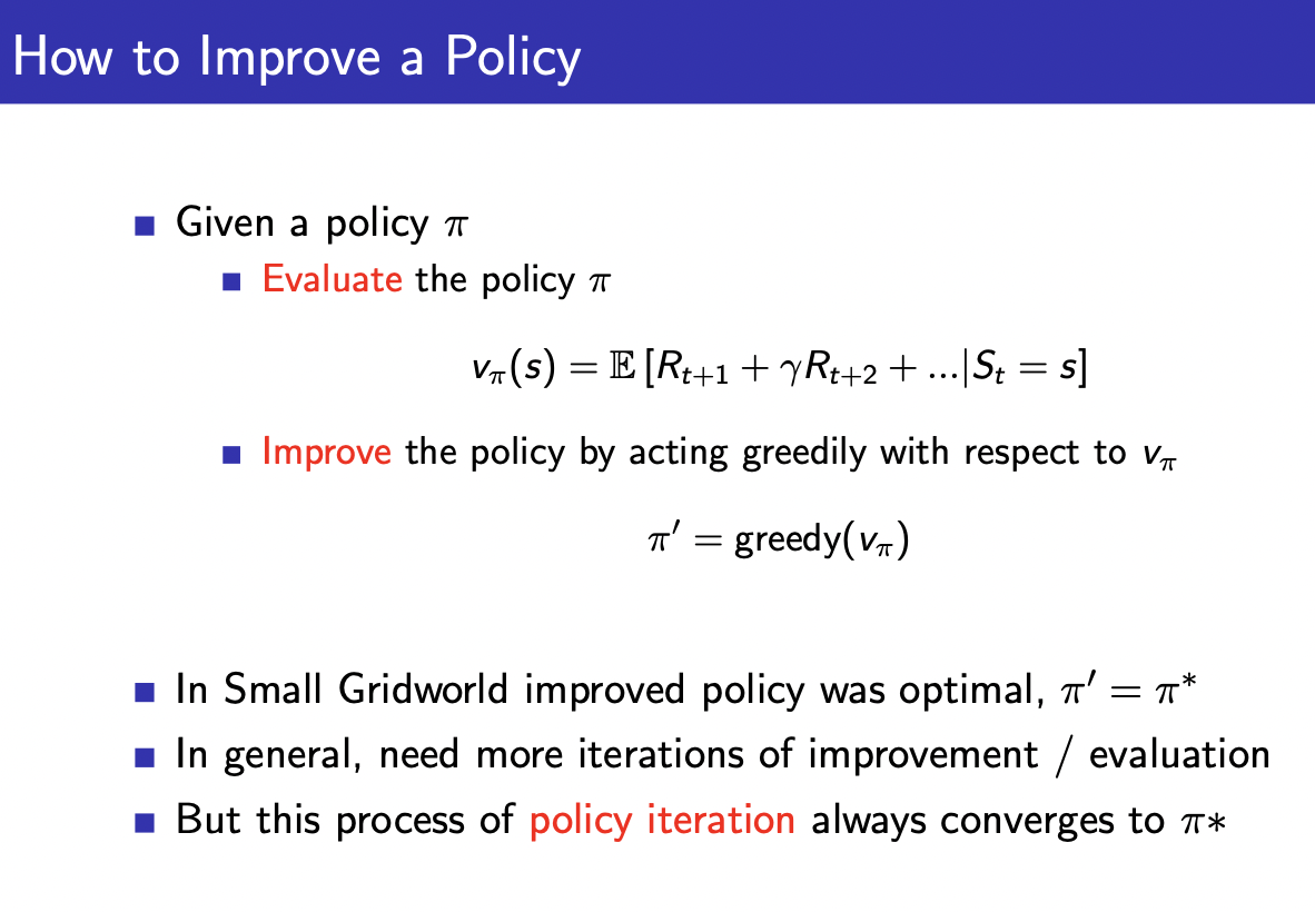 우리가 알아야 할 점은 우리는 어떤 주어진 바보같은 policy를 평가만 했을 뿐인데, 평가과정에서 얻은 value function을 가지고 greedy하게 움직이면 결국 optimal policy를 얻을 수 있다.