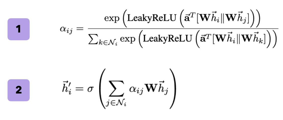 먼저 수식1부터 살펴보면, input feature들을 고차원으로 표현하기 위해 learnable parameter인 W( W ∈ R^(F ′ ×F))를 곱해주게 된다. 이후 F'길이를 갖는 두 임베딩 벡터 Wh를 Concat해주어 single-layer feedforward NN에 집어넣어준다. 이때 다시 한번 learnable parameter인 weight vector ⃗a ∈ R^(2F ′)가 등장하며, 논문에서 쓰이는 LeakyReLU는 negative input slope α = 0.2을 사용하였다.