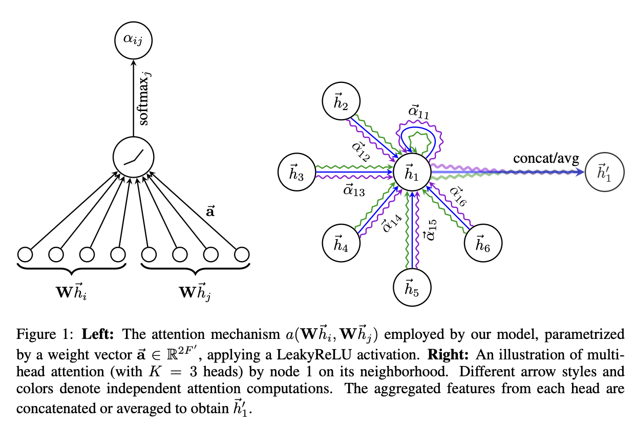 Graph attention의 핵심적인 개념은 다음 그림과 같다. 특정 노드 h1은 주위 다른 노드들과 자신에게 영향을 받아 h'으로 업데이트된다. 그림에서는 Multi-head attention을 사용했기 때문에 (heads=3) 보라,파랑,초록으로 표현된 선들이 세개씩 존재하는 것을 볼 수 있다.