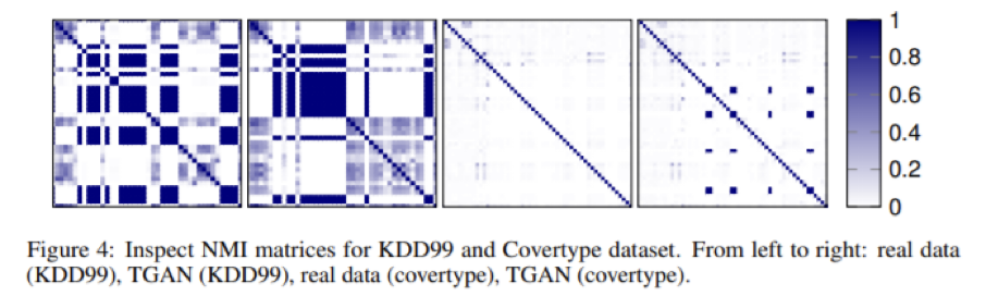여러 크기의 데이터에 대해 TGAN을 적용시킨 결과 흥미로운 사실을 발견했다. column개수가 적을수록, TGAN을 적용시켰을 때 source data의 correlation을 잘 따라가지만 반대로 데이터 사이즈가 크면 data의 context를 잘 모방하지 못한다. 예를 들어 column 개수가 10개인 데이터는 완벽하게 새로운 synthetic data를 생성해 냈지만, column 개수가 530개일 경우, synthetic data의 상관관계가 엉망이였다.