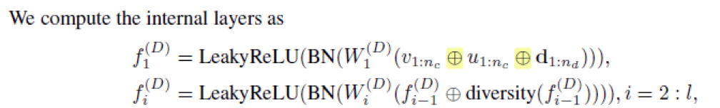discriminator의 경우 ㅣ- layer fully connected neural net을 discriminator로 사용한다. 또한 Input으로는 V, U, D를 concat하여 사용한다. 여기서 Diversity는 mini-batch discrimination vector를, BN는 batch normalization을 의미한다.