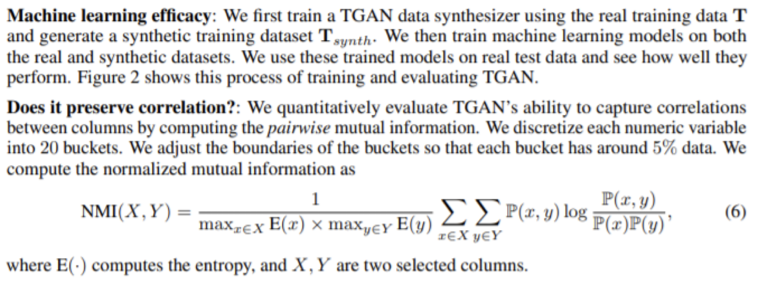 평가에서는 얼마나 TGAN이 표에 있는 variable의 상관관계를 capture했는지, data scientist들이 실제로 synthetic data를 바로 learn model에 사용할 수 있는지에 focus한다.
