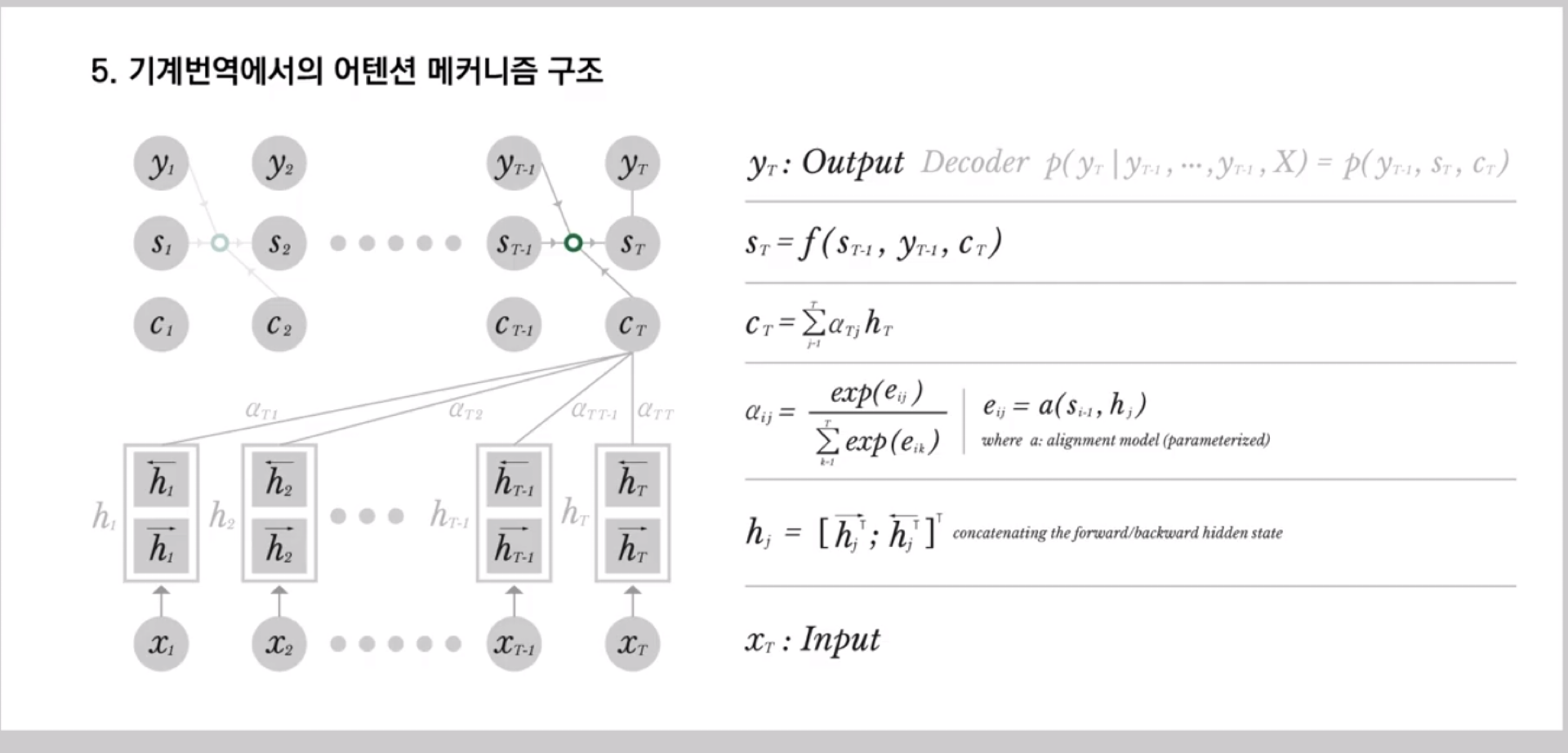 우선 인코더는 길이 T의 입력 X를 받아 히든 스테이트 벡터 h를 생성한다. a는 각 출력이 어떤 입력을 더 많이 집중해서 보면 되는지에 대한 가중치 벡터로 모든 a값들을 더하면 1이 된다. A는 attention vector를 의미한다. 디코더의 현재 시간 i의 hidden state는 이전 시간의 hidden state, 이전 시간의 디코더 출력, 그리고 현재 context vector를 입력으로 받아서 구해진다. 여기서 context vecotr는 입력 단어의 길이동안 어텐션 벡터의 가중합으로 표현되는데 이는 처음부터 끝까지 모든 단어를 보고 있음을 알 수 있는 식이다.