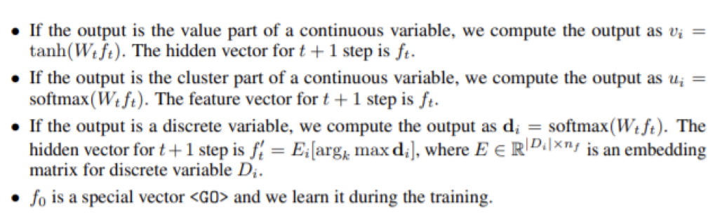 논문에서는 numerical한 변수들을 (-1, 1)의 범위의 scalar 값들로 convert해주었으며 discrete한 variable을 multinomial(수치형) distribution으로 convert해주었다.