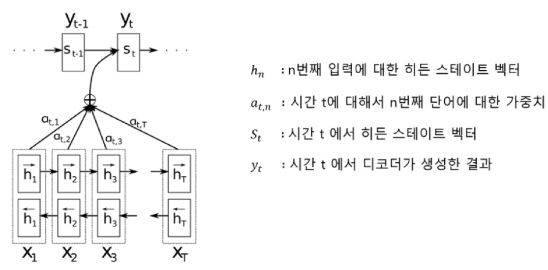 - 인코더 : 입력 시컨스를 처리하는 부분. 정보를 고정된 길이의 context vector로 압축한다. 전체 시컨스의 의미를 잘 요약해주는 역할을 한다.