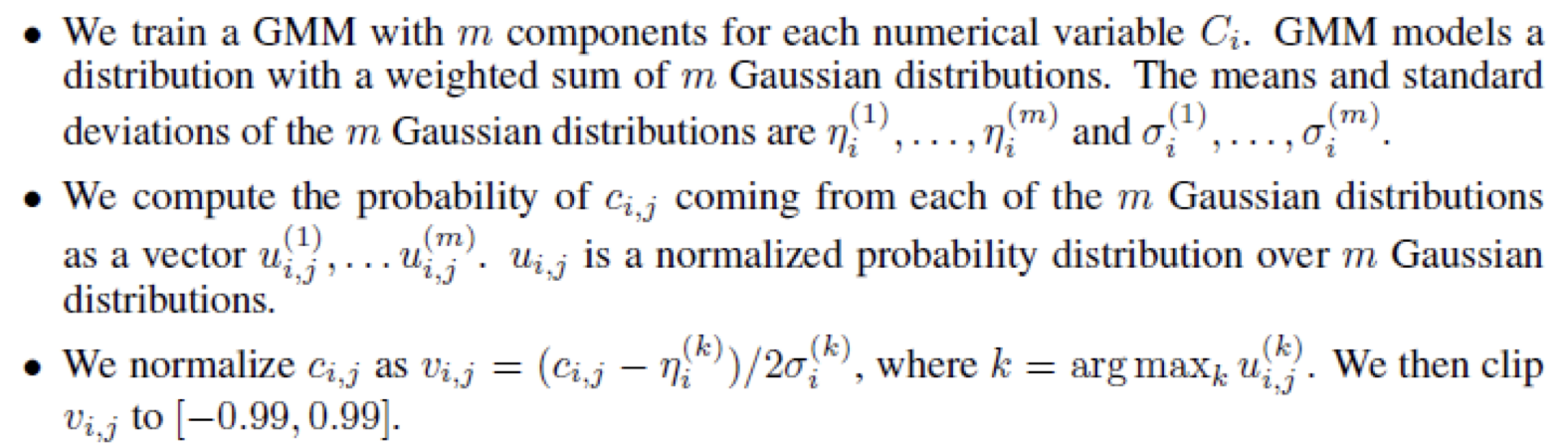 먼저, numerical한 variable Ci가 m개의 mode를 갖는다고 가정하자. 우리는 m Gaussian distribution을 갖는 확률 분포를 modeling할 것인데, 여기서 u는 C를 m gaussian distribution으로 정규화 한 것을, v는 C를 정규화 한 후 [-0.99, 0.99]로 clipping해준 것을 의미한다.