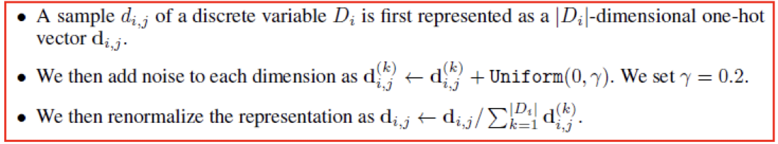 논문에서는 numerical한 변수들을 (-1, 1)의 범위의 scalar 값들로 convert해주었으며 discrete한 variable을 multinomial(수치형) distribution으로 convert해주었다.
